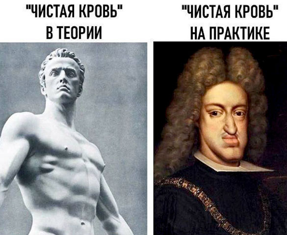 Дмитрий «Гоблин» Пучков на своём канале в Телеграм публикует две иллюстрации. На одной подпись «”Чистая кровь” в теории» и скульптурное изображение мужчины с идеальным телосложением и решительным обликом. На второй — подпись «”Чистая кровь” на практике» и портрет отталкивающего мужчины с крайне непропорциональными чертами лица, одетого по моде XVII–XVIII веков.