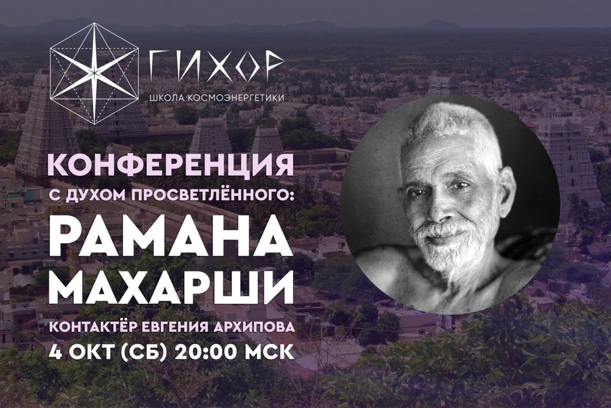 В субботу 4 октября пройдёт открытая ченнелерская онлайн-конференция и практика самадхи с духом просветлённого Раманы Махарши через контактёра Евгению Архипову. Мы поговорим о таком феномене, как просветление (самадхи) — что это такое, зачем это нужно, каждому ли доступно и какие практики и как нужно выполнять, дабы просветление обрести. Ну и, конечно, анонсируем практический курс по достижению просветления с пробуждённым последователем традиции Раманы Махарши. Свои вопросы просветлённому можно заранее написать в чате участников конференции. После конференции запись будет загружена в чат участников и останется в доступе. Рáмана Махáрши (1879–1950) — индийский мудрец и духовный учитель, который в 16 лет достиг просветления через самоисследование. Он провел оставшуюся жизнь в ашраме у подножия горы Аруначала, став символом Знания и доброты и обучая всех желающих. Время: 4 октября, сб, 20:00-21:30 МСК Контактёр: Евгения Архипова Ведущий: Иван Йонтен Допуск: все желающие, донейшн Платф
