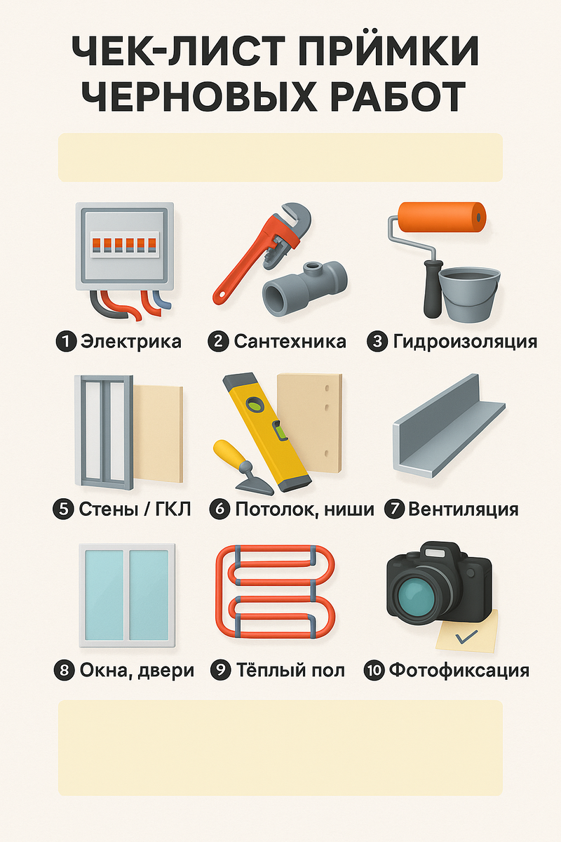 Закрывать черновые работы без полноценной приёмки — лотерея. Пройдитесь по чек-листу один раз — и вы сэкономите себе недели переделок и кучу денег.