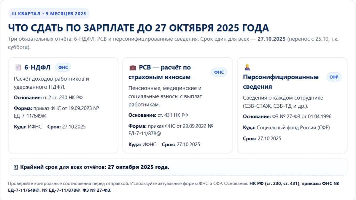 III квартал • 9 месяцев 2025 В октябре бухгалтеры подводят итоги III квартала и готовят отчёты по зарплате. Даже если сотрудников немного, обязательная отчётность есть всегда: налоги, взносы и персональные данные. Ошибка или просрочка — это штрафы и блокировка счёта. Давайте разберёмся, что нужно сдать за 9 месяцев 2025 года и до какого срока.