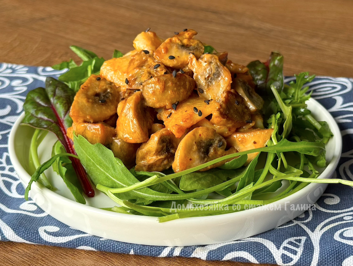 Всё началось давно: я впервые попробовала суп том ям с морепродуктами и грибами и влюбилась в его острый, кисло-сладкий вкус. Затем купила готовую пасту том ям и стала добавлять её в рыбные супы (рецепт супа прикреплю в конце). А недавно мне пришла в голову идея приготовить салат в стиле том ям. Попробовала и сразу поняла, что это именно то, что нужно. Кстати, если подать его горячим с отварным рисом, получится не просто салат, а полноценное и очень вкусное второе блюдо.