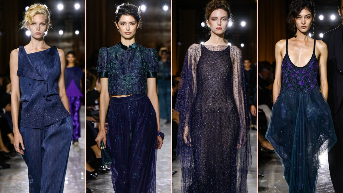 Лиловые топы надевались поверх украшенных вечерних платьев, также сверкающих пайетками или с переливающимся цветочным узором. Они были изысканны и отражали кутюрное мастерство, которое Армани удалось развить для своей коллекции Privé.