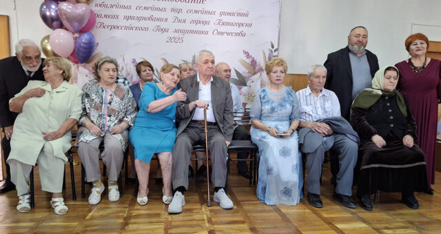 Прибыла на праздник с букетами цветов и вручила семейным долгожителям благодарственные письма главы города заместитель главы Пятигорска, начальник управления образования администрации города Наталья Васютина. Специалист Отдела ЗАГС Управления ЗАГС Ставропольского края по Пятигорску Лариса Юрьева пришла на вечер с Книгой почетных юбилейных супружеских пар, где отныне будут увековечены и росписи супругов-юбиляров-2025. Не обошла своим вниманием это торжество и председатель краевого Совета женщин, обладательница множества почетных званий и наград, депутат городской Думы Татьяна Чумакова. Татьяна Литвинова, председатель женсовета Пятигорска передала «юбилярам» благодарственные письма вместе с подарками от Татьяны Чумаковой, а также вручила медали с сертификатами от общественной организации, которую возглавляет. Не с пустыми руками прибыли на семейное торжество представители одной из офтальмологических клиник, вручившие ветеранам семейной жизни сертификаты на бесплатное диагностирование зрения.