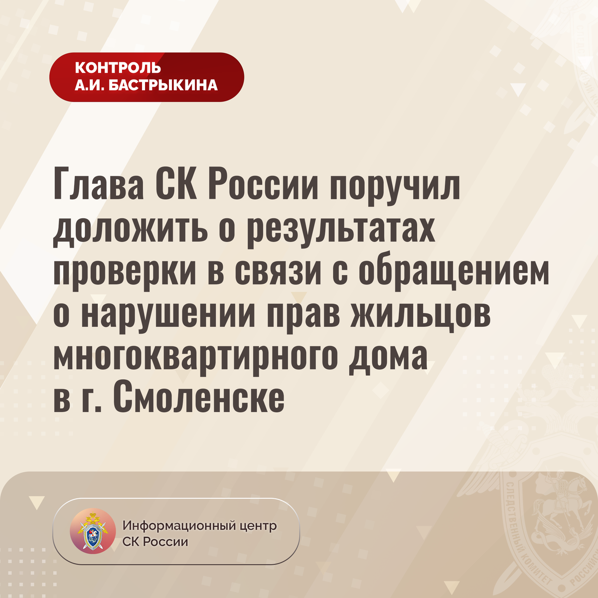 Глава СК России поручил доложить о результатах проверки в связи с обращением о нарушении прав жильцов многоквартирного дома в г. Смоленске В социальной сети размещено видеообращение к Председателю СК России А.И. Бастрыкину жильцов многоквартирного дома на улице Кирова города Смоленска по вопросу нарушения их прав. На первом этаже здания функционирует кафе, постояльцы которого систематически нарушают общественный порядок и режим тишины в ночное время. Многочисленные обращения граждан в компетентные органы результатов не принесли. В СУ СК России по Смоленской области организована процессуальная проверка. Председатель Следственного комитета Российской Федерации Александр Иванович Бастрыкин поручил руководителю СУ СК России по Смоленской области Анатолию Юрьевичу Уханову доложить о промежуточных результатах процессуальной проверки и принятом по итогам решении, поставив ее на контроль в центральном аппарате ведомства. #СледственныйКомитет #СКРоссии #СКР #ИЦСКР #ИнформационныйЦентр #Александ