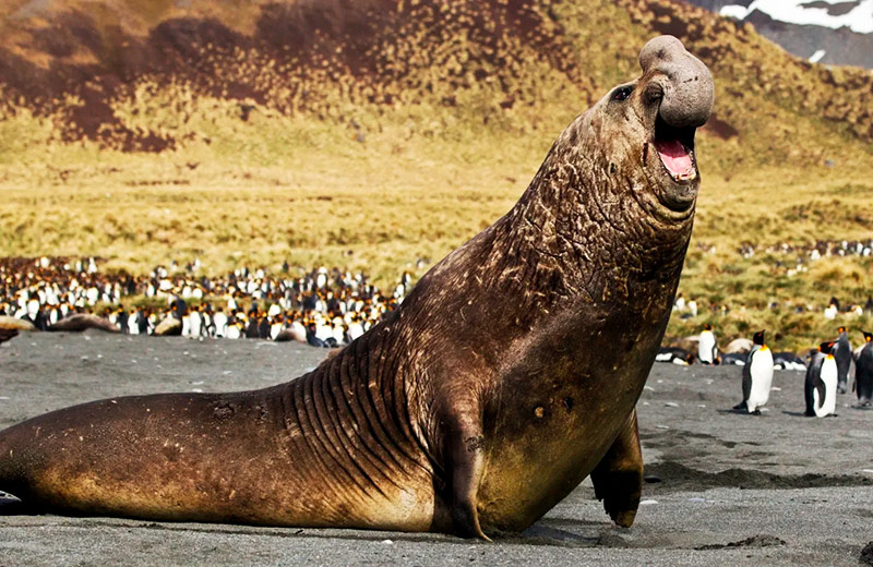 Самцы южных морских слонов отличаются характерным хоботом, который они могут надувать, словно эластичный шар.
