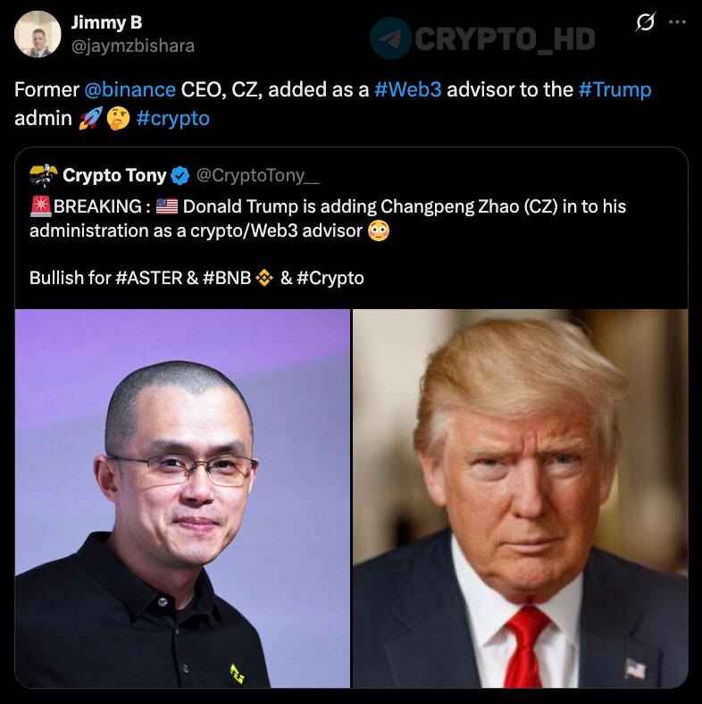 🤨 В Twitter активно распространяются слухи о том, что CZ может стать криптовалютным советником Дональда Трампа.