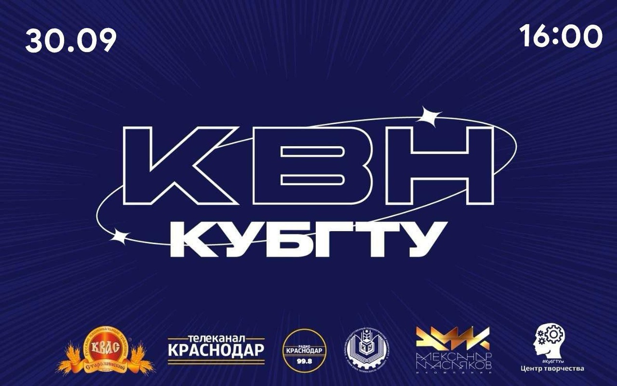 ☄️Новый сезон Открытой лиги КВН КубГТУ 30 сентября в 16.00 ул. Красная 135, 2 этаж, Центр творчества КубГТУ 🔼Розыгрыш призов для зрителей 🔼Разминка с залом 🔼Звёздное жюри 🔼Призы и подарки от партнёров В игре принимают участие команды: «Сопрано» - ФЭУБ «Корнишоны по-французски» - ФБПП «Всё сложно» - ФНГЭ «Ва-банк» - АМТИ «Смешные типсоны» – ФИМТ и ИТК «Сборная станицы Медведовской» - ФНГЭ «Идеальные девушки» - Женская сборная «Леся Овсянникова» - молодёжная сборная «Децибелы» - Академия И. Крутого «Чикиряут» КубГУ 💥Всех ждём! Начало игры в 16.00 #ЦентрТворчестваКубГТУ #КубГТУм #КубГТУ #КубанскийПолитех #КВНКубГТУ