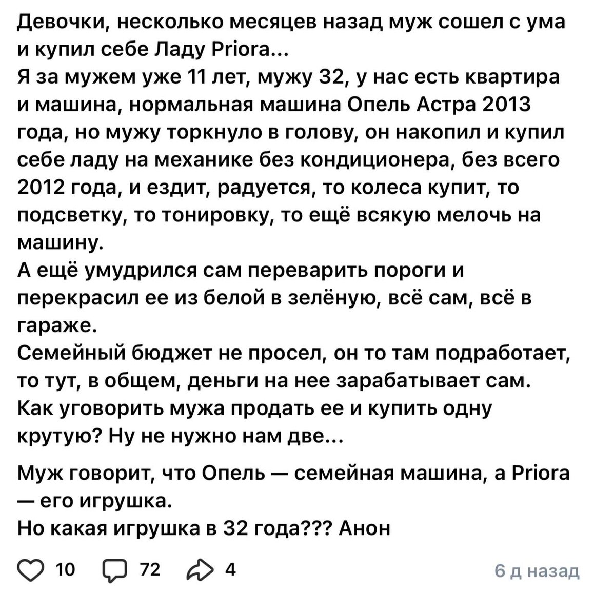 Возмутило такое сообщение Дело в том, что это не редкость в отношениях. Когда жена против личных дел своего мужа Давайте разберём её. Мы не судим, но мы обсудим😂 🤓Что увидел Я: 1. Сильное чувство обиды на мужа (Просто почувствуйте как сквозит обидой в тексте и дело тут не в машине) 2. Зависимость от чужого мнения (купить одну крутую) 3. Нарушение иерархии (жена хочет доказывать, что мнение и желания мужа НИЧТО, по сравнению с ЕЁ желаниями) 4. Возможно тревожит чувство одиночества, ревность, зависть («ездит, радуется», а я мол одна на меня внимания нет) Итог: на этом примере вы можете увидеть как детские установки, не восполненные эмоции и чувства в детстве, отражаются на взрослой жизни. А что думаешь ты? Пишите свой ответ в комментариях⬇️⬇️⬇️