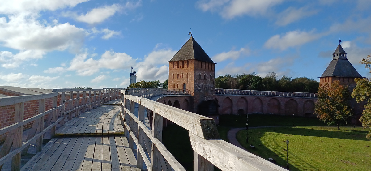 👉 Новгородский кремль - один из древнейших кремлей России, он был построен в 1044 году. Мощные стены, протяжённость которых 1487 метров сохранились практически в первозданном виде. Их строили из местного известняка и кирпича, они достигают высоты 8–10 метров при толщине от 3 до 6 метров. Первоначально Кремль имел 12 башен, но до наших дней сохранилось только 9.