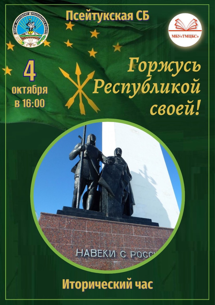 📣Анонс. Исторический час «Горжусь Республикой своей!» 📆4 октября 2025 г. 🕓16:00 – 17:00 🏡Псейтукская СБ Любовь к Родине начинается с любви к малой родине, земле, где родился и вырос. На нашем историческом часе мы погрузимся в богатую историю образования Республики Адыгея, её героическое прошлое и настоящее, традиции и обычаи, культурные ценности и природные богатства родного края. В программе: - Рассказ об истории и культуре Республики Адыгея. - Знакомство с символикой региона. - Викторина «Символы Адыгеи» для самых любознательных участников. - Чтение стихов о Родине и родном крае. - Прослушивание гимна Республики Адыгея. - Презентация «Земля родная – моя Адыгея». Также в библиотеке будет оформлена книжная выставка, где вы сможете познакомиться с материалами о культуре и быте нашей Республики.