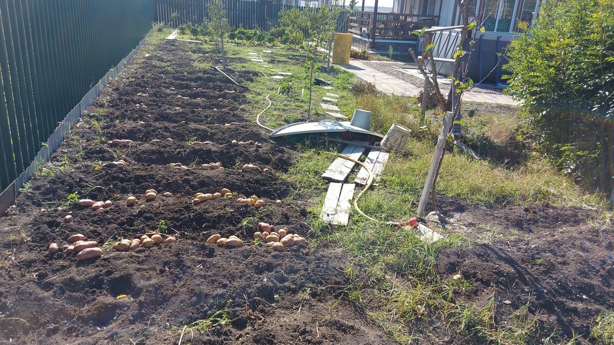 Я в мае писал статью об эксперименте посадке картошки в гребни https://dzen.ru/a/aEnmX0TtWQbW5msU Было бы правильно показать урожай картошки с этих гребней. Сразу заранее скажу. Ранее мы жили в Бердске под Новосибирском и картошка давала урожай там только на хорошей земле. А так в основном урожаи были не очень. В конце 2024 года мы переехали в Краснодарский край, под Новороссийск, и посадили картошку здесь значительно позже всех. Здесь принято садить картошку в феврале в окне тёплой погоды. Урожай снимается примерно в июне и идёт повторная посадка картошки с урожаем под конец года. Мы высадили картошку 25-26 апреля по причинам, что на новом участке надо было привезти землю и её разровнять и подготовить под грядки. Вручную 12 камазов земли по 10 кубов каждый, сложно быстро раскидать и перетащить равномерно по будущему огороду и клумбам. Это и была причина поздней для этих мест посадки картошки (пару раз была вызовов скорой из-за срыва спины от перебора тяжести, с учётом ещё 8 камазов