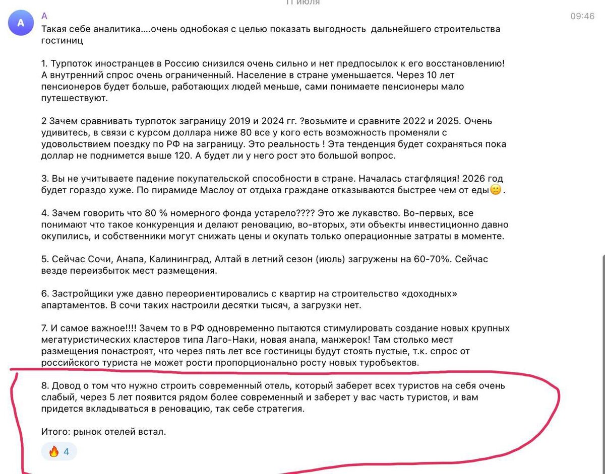 Сегодня завершаем наш разбор комментария последним пунктом👇🏻(остальные ответы можно посмотреть здесь: п1, п2, п3, п4, п5, п6, п7) Довод о том что нужно строить современный отель, который заберет всех туристов на себя очень слабый, через 5 лет появится рядом более современный и заберет у вас часть туристов, и вам придется вкладываться в реновацию, так себе стратегия. Ответ: через пять лет принципиально более современный отель рядом не появится. Существенные изменения в архитектуре и правилах проектирования происходят гораздо реже. После перестройки был жесткий слом парадигмы из-за честности отделения отрасли, но в ближайшие 20–30 лет таких кардинальных изменений не предвидится. Современные проекты закладываются со свободной сеткой колонны, что позволяет гибко работать в космосе и проводить работы без критических ограничений. Конечно, через 20–30 лет могут появиться новые технологии и предпочтения гостей, но построить бизнес с горизонтом планирования в несколько уровней — нормальная