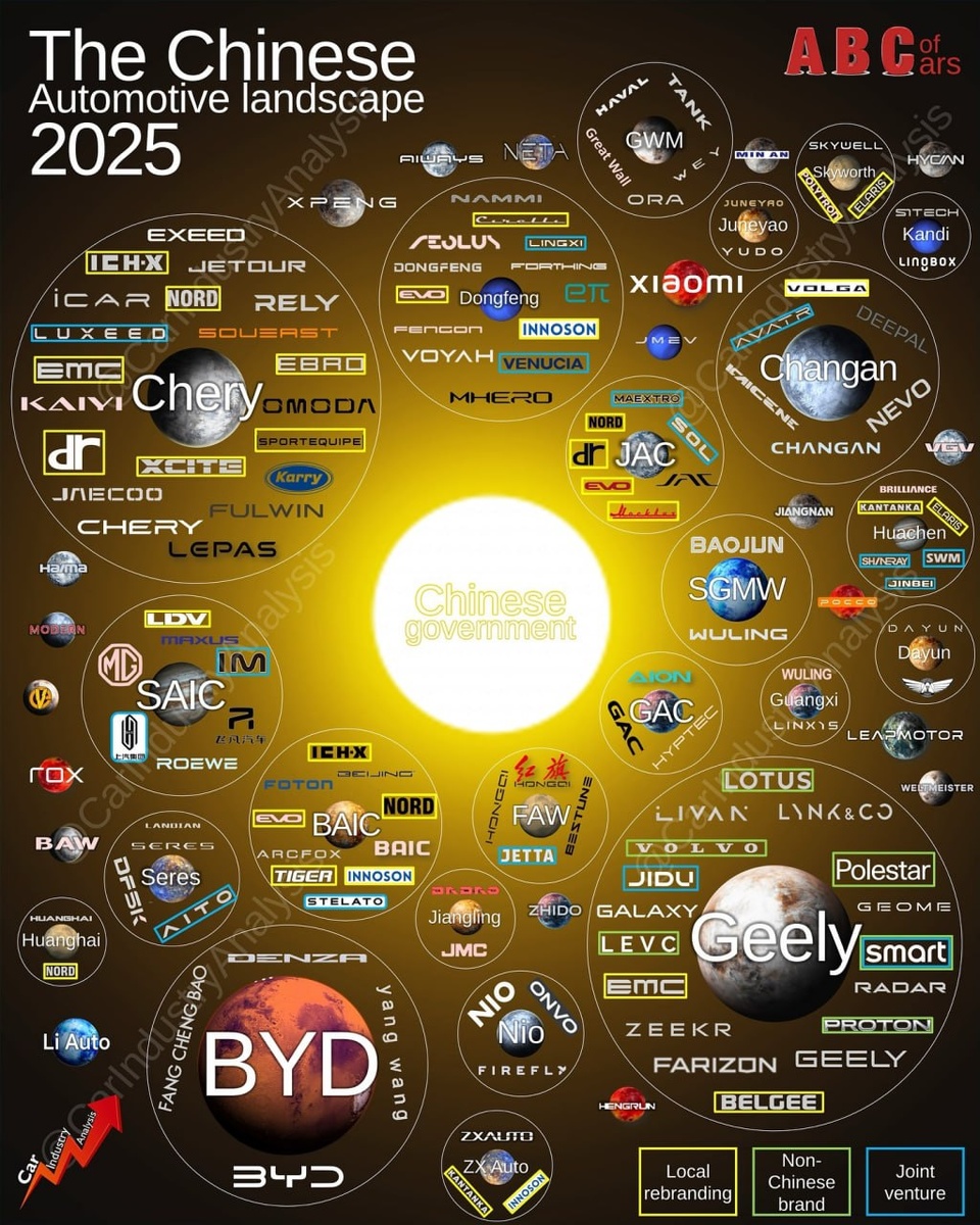 Эту тему, что называется, подсказал читатель. Прислал в бота ссылку на статью в авторитетном Carscoops и предложил найти на инфографике с китайскими брендами один, внезапно написанный на кириллице. Нашли, удивились и теперь рекомендуем сделать это интересное упражнение на внимательность вам. Если кратко - западный мир открыл окно на восток и теперь пытается понять, кто есть кто среди китайских автопроизводителей. И аналитик Фелипе Муньос, который ведет в запрещенных соцсетях популярные паблики под названием Car Industry Analysis, предложил свой взгляд на эту тему. На первой схеме он расставил бренды по группам, к которым они принадлежат, и разместил их в разном удалении от "солнца" - государства. Чем ближе группа к ядру, тем больше в ней проявляется государственное участие. Вторая иллюстрация - это своеобразная пирамида по статусу 109 китайских марок. Чем ниже - тем проще и дешевле. Чем выше - тем круче. Даже беглый взгляд на инфографику дает понимание, что Муньос, вероятно, не см