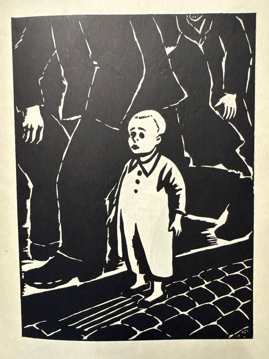 Гравюра Франса Мазереля 1920 года из немецкого альбома, изданного в Дрездене в 1957 году и фотопортрет автора (собственно, самого Франса Мазереля) оттуда же.