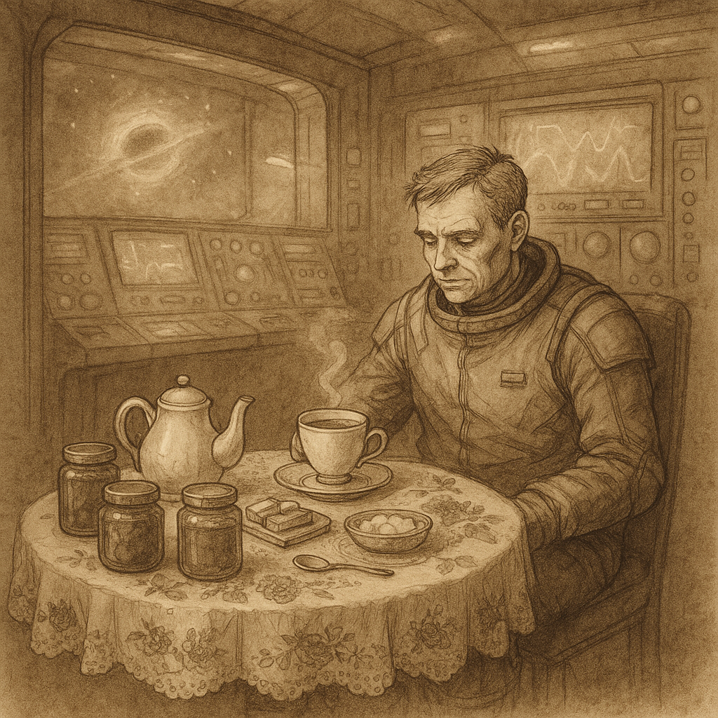 Сначала маленький столик, специально выписанный для этого с базы, раскладывался и устанавливался в центре дежурки. Столик накрывался белой скатертью, вышитой алыми розами и лиловыми ирисами еще прабабушкой Андрея Никитича. Скатерть провалялась в сундуке не один десяток лет и местами пожелтела, но в глазах Андрея Никитича это было не недостатком, а, скорее, достоинством. Сверху на скатерть укладывалась кружевная салфетка из обычного пластиката, призванная защитить семейную реликвию от возможных пятен. Затем на столике появлялись банки с вареньем трех сортов и медом. Мед Андрей Никитич предпочитал липовый. Чайная пара из настоящего фарфора, тонкая и почти прозрачная, дополнялась серебряной чайной ложечкой. Затем на столе появлялись кусковой сахар и печенье, синтезированное по собственному рецепту Андрея Никитича.