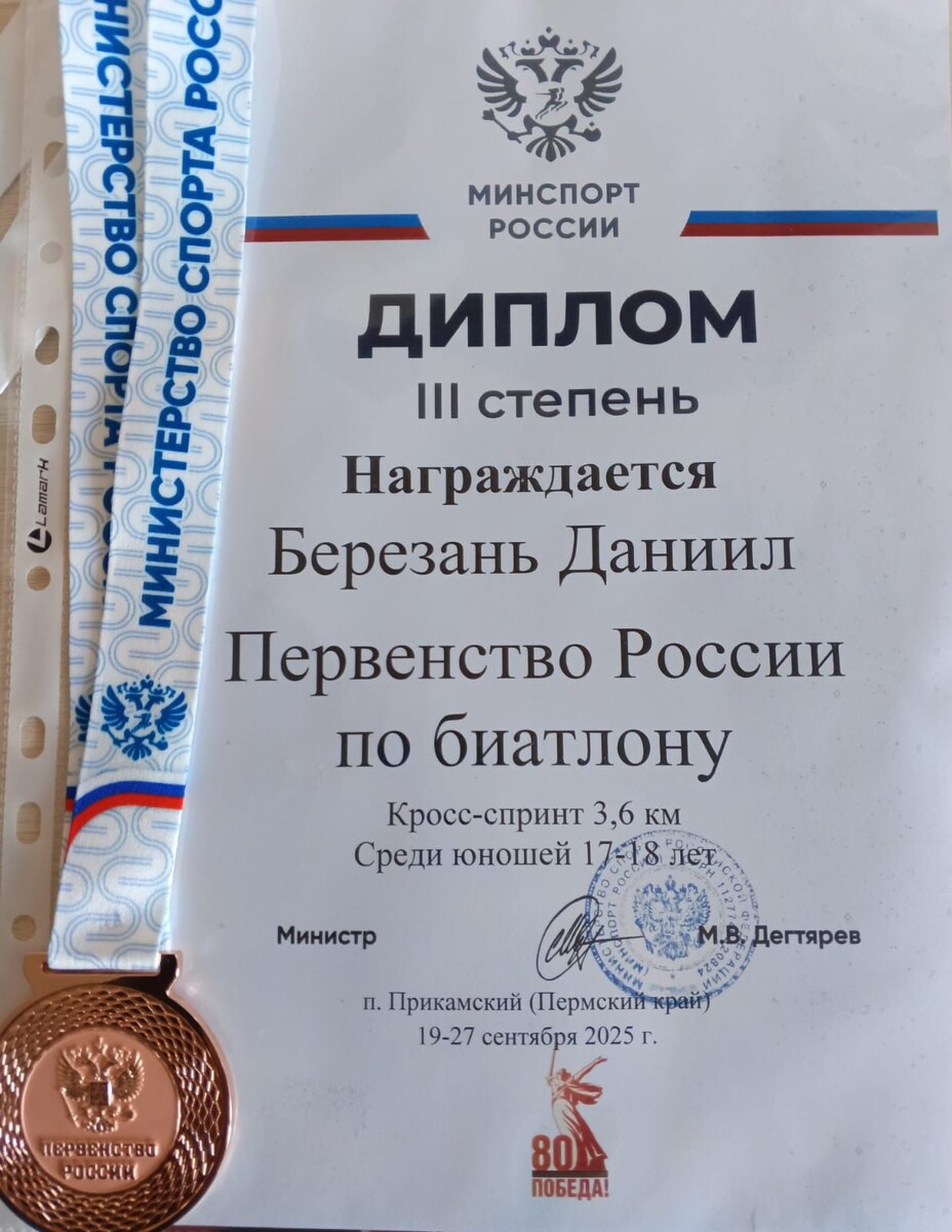 Даниил Березань завоевал бронзу на первенстве России по биатлону, проходившем с 19 по 27 сентября в городе Чайковский Пермского края. В соревнованиях среди юношей и девушек 17-18 лет приняли участие 252 спортсмена из 35 регионов страны. Турнир проходил на базе лыжно-биатлонного комплекса Федерального центра «Снежинка» и включал четыре дисциплины: роллеры-гонка, роллеры-спринт, роллеры-эстафета и кросс-спринт. Сборная команда Камчатского края, в состав которой вошли спортсмены из Елизовского района, выступала под руководством тренера-преподавателя Игоря Козака. Значимым достижением стало выступление елизовского спортсмена Даниила Березаня в дисциплине «Кросс-спринт» (3,6 км) - он завоевал бронзовую медаль. В других дисциплинах спортсмены из Елизовского района показали следующие результаты. Роллеры-гонка 12,5 км (всего участвовало 139 человек): - 23 место – Даниил Березань; - 84 место – Руслан Баембетов. Роллеры-гонка 10 км (всего участвовало 107 человек): - 19 место – Милена Березань; -