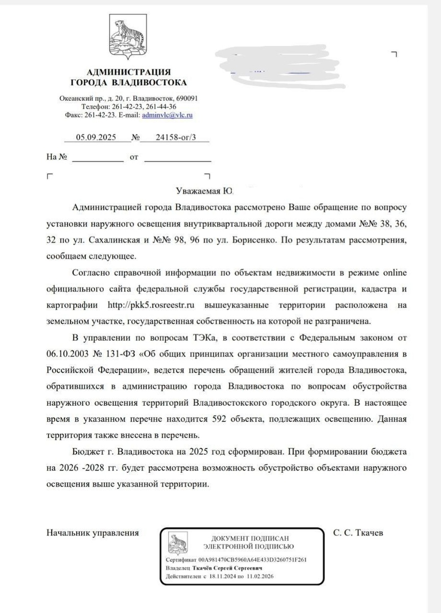 В ответ на пост 💡За 10 лет обращений, не могут установить хотя бы один фонарный столб⬇️ Вот такие ответы, более 10 лет, только из года в год отодвигают сроки! Нет у администрации возможности установить на этом участке тротуара пару столбов или даже один двухрожковый. Выросло не одно поколение детей идущих по дороге в школу в темноте! Обращения неоднократно и годами были написаны не только в администрацию, но и депутатам по округу Думы и Заксобрания, различных созывов, но результата нет! Что остаётся, воспользоваться правом написать обращение в приёмную президента России и полпреду ДФО? 🗺@yurovmedia⏺