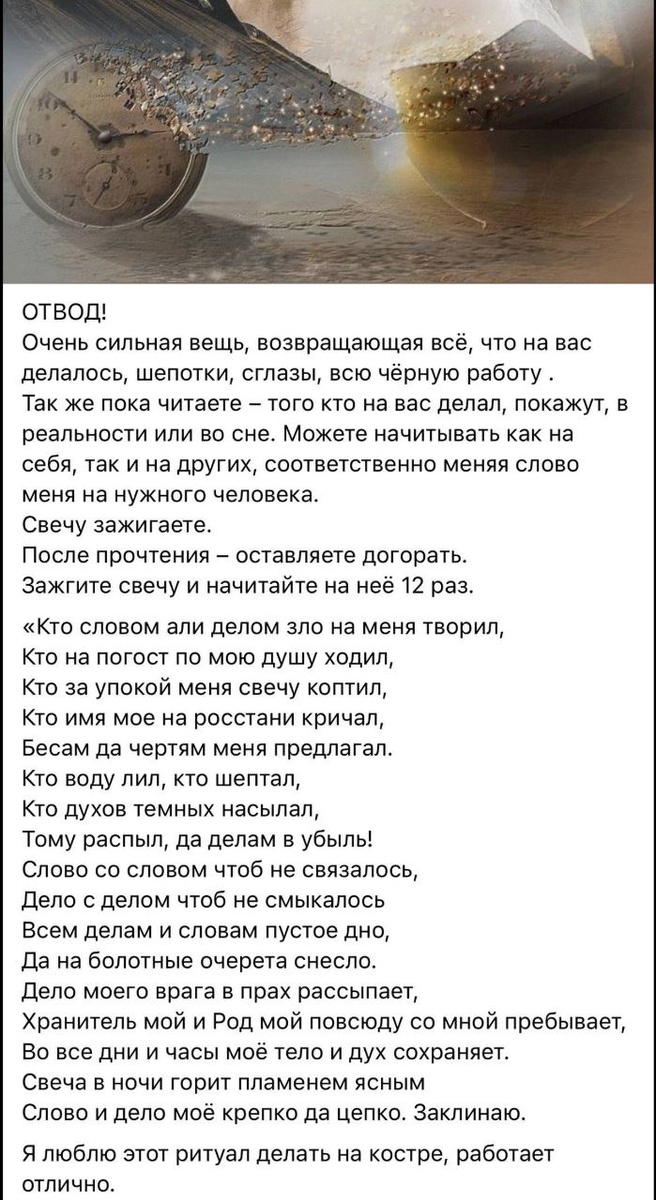 Занесено подписчиком канала из ВК. У меня, как обычно, к таким подаркам, есть вопросы и встречные предложения 🙂 1. Почему это отвод? Отвести - это убрать вектор негативной программы с себя на кого-то другого, лучше, конечно навесить все это добро автору/исполнителю/им двоим вместе (по подаче и отдача). Здесь строятся всякие козни врагам (что б ничего не получалось), идет, по сути, обмен ударами "ты мне каку, а я тебе на твою игрушку - ломаку". А отводится-то что и куда именно? И как? 2. Ну, допустим, это возмездие (для предупредительного действия, конечно, поздновато спохватились отвечать). Кто это все делать будет? К кому обращаются в заговоре в данном случае? Кто первый из услышавших подорвется? Первыми, скорее всего, подорвутся темные. Могут и помочь для начала, чтобы человека на свою сторону затянуть. А светлым оно, по вашему мнению, так сильно надо и сильно лестно, что "бегут, роняя тапки и волосы назад"?! Потому, что вы свечку зажгли и 12 раз складный стишок прочитали? 3. Ч