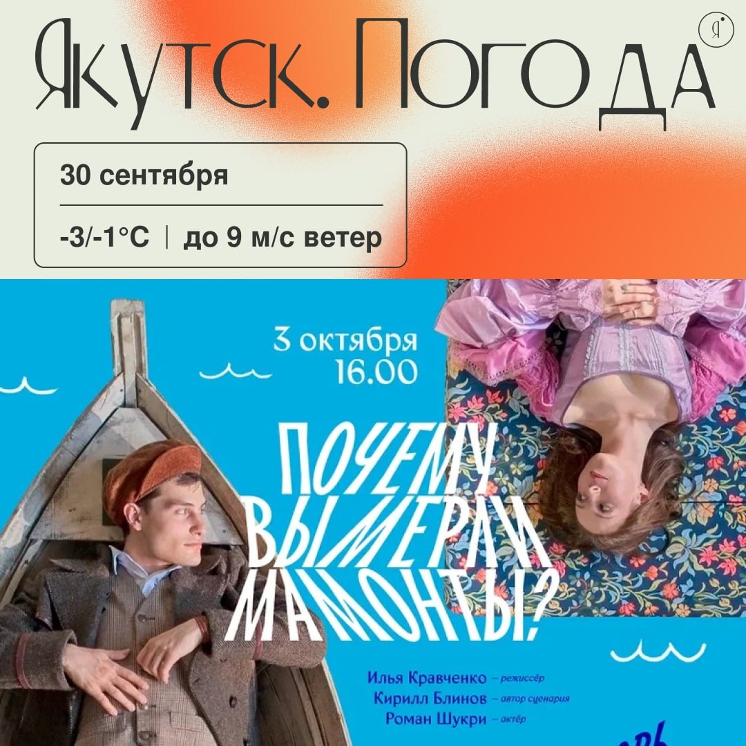 С добрым утром! В кинотеатре Лена проведут бесплатный кинопоказ На большом экране покажут художественный фильм «Почему вымерли мамонты» режиссера Ильи Кравченко. 🤩 По сюжету молодой актёр Севастопольского театра Андрей Стаханов страдает от ощущения неполной жизни. На сцене он исполняет роли героев, но сам ещё никогда не переживал ни настоящих приключений, ни подлинной любви, ни ясной цели. В поисках себя он отправляется в Арктику - туда, где надеется обрести и чувство, и смысл, и своё предназначение. В дороге Андрей встречает людей, для которых приключение - часть повседневности. Вместе с ними ему предстоит сделать научное открытие и раскрыть тайну исчезновения мамонтов… 🤩Показ состоится 3 октября в 16:00 в к/т Лена Вход бесплатный Регистрация Online Якутия | Подписаться