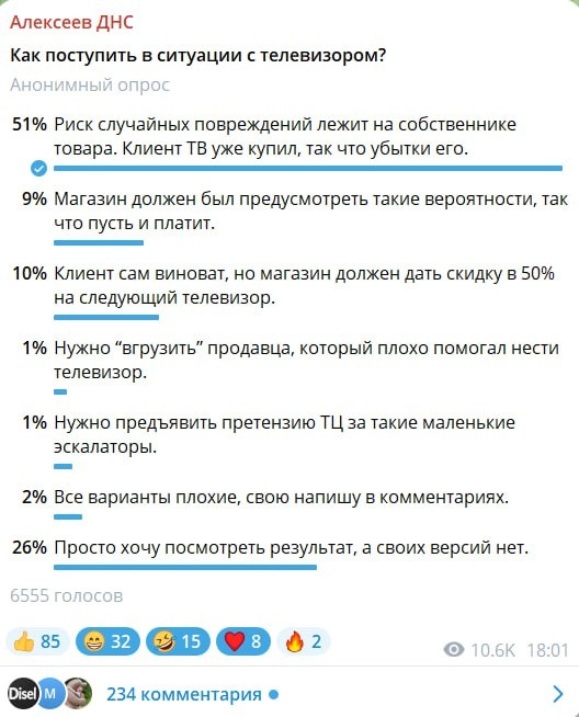 В ответ на пост Владелец сети магазинов техники DNS Дмитрий Алексеев высказался по поводу разбитого при транспортировке телевизора, отметив, что не видит вины ни магазина, ни продавца. — Уже кто только не спросил меня о судьбе несчастного телевизора и причастных лиц, Честно говоря, даже не понимаю, почему это так завирусилось и получило такой резонанс. Сразу скажу — всё хорошо, все живы-здоровы, и кроме телевизора никто не пострадал. Более того, инцидент уже имел своё разрешение. Но, прежде чем рассказать, чем всё дело кончилось, позвольте добавить деталей и спросить у вас: а как, по-вашему мнению, нужно было поступить? — объяснил бизнесмен. По его словам, клиент купил в магазине большой телевизор. У магазина есть грузовой лифт, на котором штатно осуществляется погрузка/выгрузка. Но покупатель настоял на спуске по эскалатору, так как это ему было удобнее. Нести телевизор помогал сотрудник магазина, он был сзади, клиент нёс спереди, и «именно он почему-то не стал опускать телевизор на