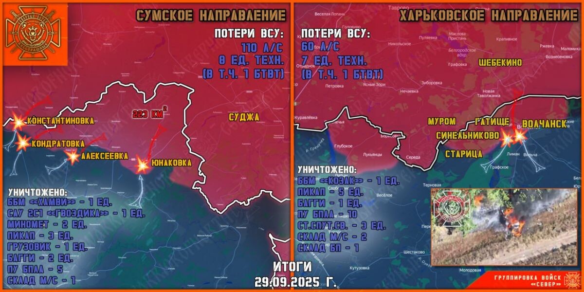 К утру 30 сентября появились новые подробности создания полосы безопасности в Харьковской и Сумской областях Украины, в том числе на подступах к Курской области России. По всему участку фронта авиация РФ и артиллерия группировки «Север» сносили живую силу ВСУ. Десантники и морпехи продвигаются вглубь Сумской области. Противник трижды контратаковал в районе Константиновки, Кондратовки и Алексеевки. Успеха враг не имел, с потерями отошел на исходные рубежи. Враг потерял одну ББМ «Хамви». В результате безуспешных атак враг потерял более 50% личного состава. На Теткинском и Глушковском направлениях не зафиксировано перемен. Артиллерия Северян и расчеты БПЛА работают по маршрутам снабжения ВСУ.