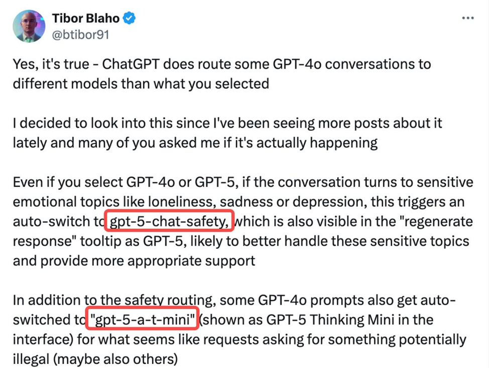 В сообществе пользователей OpenAI разгорелся скандал, получивший название «GPT-гейт». Пользователи обнаружили, что OpenAI без уведомления и согласия перенаправляет запросы с топовых моделей GPT-4 и GPT-5 на скрытые, менее мощные модели — «gpt-5-chat-safety» и «gpt-5-a-t-mini». Это происходит даже у платных подписчиков Plus и Pro, что вызвало волну возмущения по поводу ущемления прав пользователей и снижения качества сервиса. Расследование показало: если система считает ваш запрос «чувствительным» или эмоциональным, она автоматически заменяет выбранную вами модель на одну из «секретных» — с усиленной фильтрацией и ограничениями. Это касается не только экстремальных тем, но и обычных сообщений с эмоциональной окраской. Пользователи массово подтверждают этот эффект в соцсетях и на Reddit: даже при выборе GPT-4.5 или GPT-4o, система может незаметно переключить вас на другую модель, а ответы становятся менее точными и более «стерильными». Особенно это заметно при обсуждении тем, связанных с