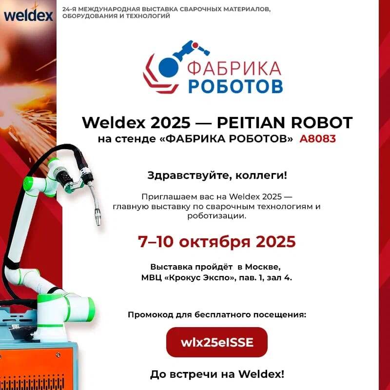 Здравствуйте, коллеги! Приглашаем вас на Weldex 2025 — главную выставку по сварочным технологиям и роботизации. Выставка пройдёт 7–10 октября 2025 в Москве, МВЦ «Крокус Экспо», пав. 1, зал 4. Бренд PEITIAN ROBOT будет представлен на стенде «ФАБРИКА РОБОТОВ», A8083. Всё время работы выставки на стенде будут наши специалисты — приходите в удобный для вас момент. На нашем стенде вы сможете: * познакомиться с командой и обсудить задачи вашего производства; * получить практические рекомендации по роботизации сварки и смежных операций; * узнать о действующих мерах господдержки и типовых дорожных картах внедрения; * получить эксклюзивные условия для участников выставки. Регистрация для бесплатного посещения: weldex.ru/ru/visit/visitor-registration/ Промокод: wlx25eISSE — введите при регистрации. До встречи на Weldex! PEITIAN ROBOT / «ФАБРИКА РОБОТОВ» peitianrobots.ru