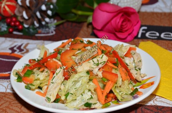 Салат "Сицилия" Ингредиенты: Салат китайский - 1 кач. (хватит 6 листов) Куриная грудка - 180 гр. (отварная) Перец болгарский - 140 гр. Морковь - 100 гр. Лук зелень - 0,5 пуч. Укроп - 0,5 пуч. Для заправки: Чеснок - 1 зуб. Соус соевый - 20 мл. (1 ст. л.) Масло растительное - 20 мл. (1 ст. л.) Горчица - 2 гр. (0,5 ч. л.) Соль - 3 гр. (по вкусу) Перец черный молотый - 1 гр. (по вкусу) Источник: https://rusdinner.ru/page/salat-sitsiliya