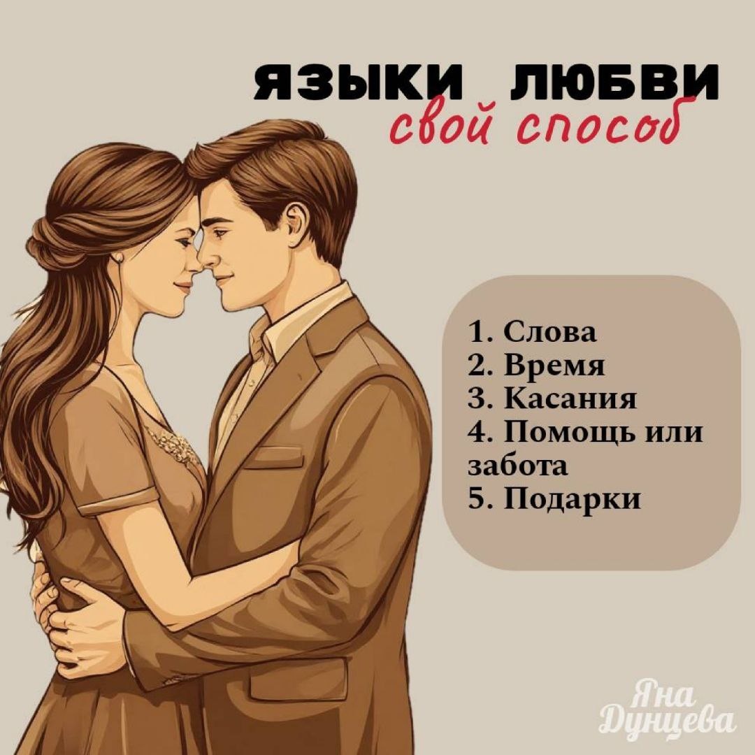 💕ЯЗЫКИ ЛЮБВИ Друзья мои , здравствуйте! У нас тема отношений продолжается! 💞 Сегодня поговорим о важном, о языках любви. Если у вас есть пара, то определить нужно не только свой, но и язык любви вашего партнёра. Это ключ к пониманию! Почему это так важно? Давайте на примере. Представьте: жена обожает дарить подарки 🎁 Она с удовольствием выбирает мужу сюрпризы, даже без повода. А в ответ... получает лишь слова благодарности и комплименты. И она обижена: «Он ничего мне не дарит, значит не любит!». Ведь для неё подарки - это и есть главное доказательство любви. А муж, в свою очередь, в недоумении и тоске. Он приходит уставший с работы, старается, копит на отпуск, помогает по дому и жаждет всего одного: чтобы его похвалили, поддержали, сказали «я тобой горжусь» 👏. А она вместо этого дарит какую-то «ненужную фигню». И он думает: «Да она меня совсем не ценит и не любит!». Знакомо? 😢 А на самом деле, два человека очень сильно любят друг друга, но говорят на разных языках. Каждый д
