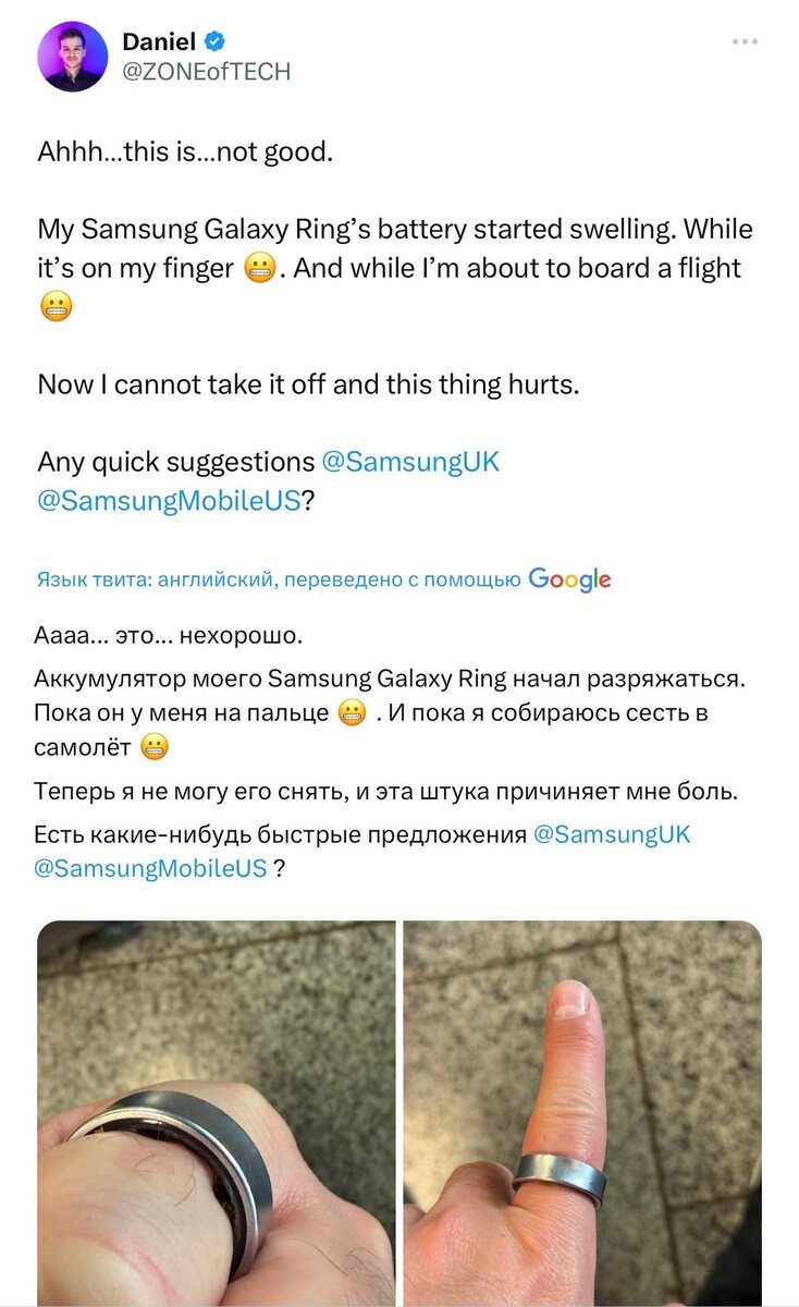 Айтишник едва не потерял палец из-за «умного» кольца Samsung Galaxy Ring — аккумулятор гаджета начал раздуваться прямо на его руке, когда тот был в аэропорту. Снять кольцо самостоятельно парень не смог — из-за деформации и боли любое движение оказалось мучительным. В итоге его сняли с рейса и увезли в больницу, там врачи использовали лёд и специальную смазку, чтобы аккуратно снять устройство. Страшно. CtrlAltDelights- подписаться