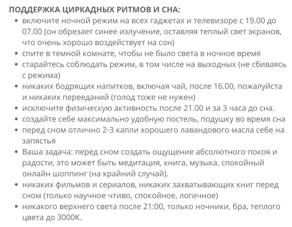 Достаточный сон — это когда вы просыпаетесь за 5 минут до будильника с субъективным ощущением, что вы выспались. Важно не устраивать себе джет-лагов на выходных, вставая позже и ложась позже. Максимум, что можно — это встать позже, но лечь во время, как обычно.