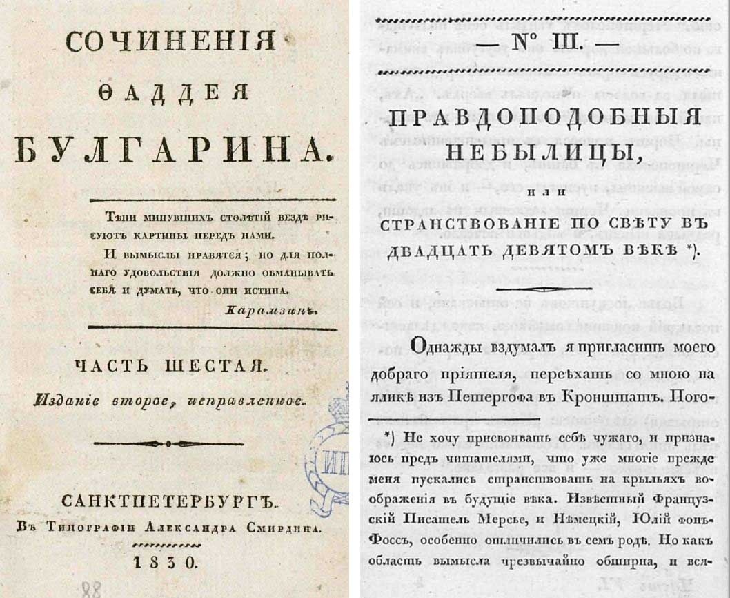 И очень похоже (аргументацию я приводил в прошлых статьях), что, и VI том ПСС Ф. Булгарина "Повести и нравы" целиком на деле принадлежит А.И. Сулакадзеву. В том числе и напечатанная там повесть: «Правдоподобные небылицы, или Странствование по свету в 29-м веке», вышедшая в 1824 году и переизданная в 1830-м.