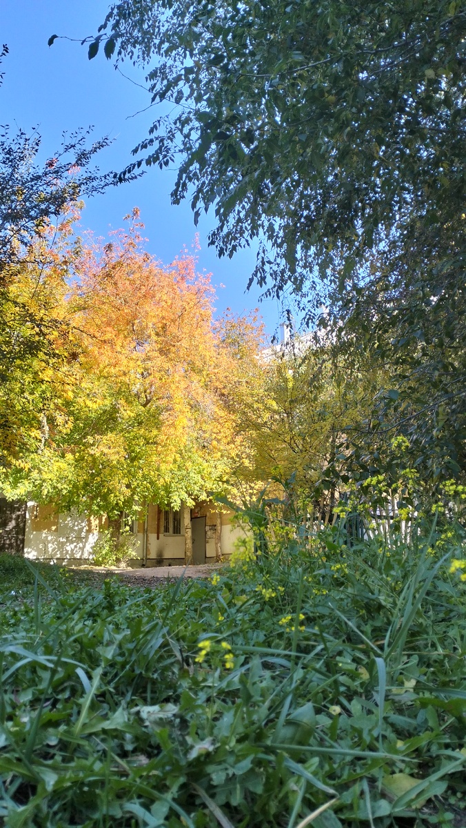 Пожалуй, ни одно время года не может похвастаться таким разнообразием красок как ранне-средняя осень. Это фото - не фотошоп, обычный снимок на смартфон, а здесь и яркая лазурь неба, янтарь и золото тополиной листвы, и сочная зелень травы, и даже желтизна последних цветов. Настоящая услада для глаз. Бабье лето долго радовало нас - почти неделю продержалась жара около +25. Мы потели, жмурились, но не хотели пропустить ни минуты этого последнего щедрого подарка осени. По правде говоря, когда сегодня я увидела за окном серый дождик и серое же небо, а по пути в садик ощутила прохладу, то даже немного обрадовалась - и красота затянулась, да и жарко было дома, батареи топят как шальные, плюс ещё и на улице жара.