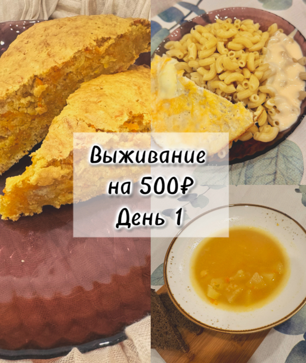 Девочки и мальчики, привет 👋 Вот и стартовал наш новый (а для кого-то уже знакомый) проект: выживание на 500₽ неделю вдвоем. Если перевести в цифры, выходит всего по 35,7₽ на день на одного человека. Согласитесь, звучит пугающе мало. Но именно поэтому этот эксперимент так интересен. Хочу сразу напомнить: мы не живём так постоянно 🙅♀️. Это эксперимент, вызов, проект, диета - называйте как хотите. У всех нас бывают разные жизненные ситуации, и к сожалению, иногда приходится искать способы выкрутиться из непростых обстоятельств. А я хочу показать на своём примере, что даже из маленького бюджета можно собрать меню на неделю. Сможем ли мы выдержать эти семь дней - честно, не знаю. Но мы будем очень стараться 💪. 🥕 Завтрак - морковный пирог. Сегодня решила удивить себя. Обычно я пеку кексы по «нормальным» рецептам с яйцами и молочными продуктами. Но в рамках нашего бюджета пришлось искать вариант проще. Получился постный морковный пирог. Ингредиенты: Как готовила: 📌 Пирог получил