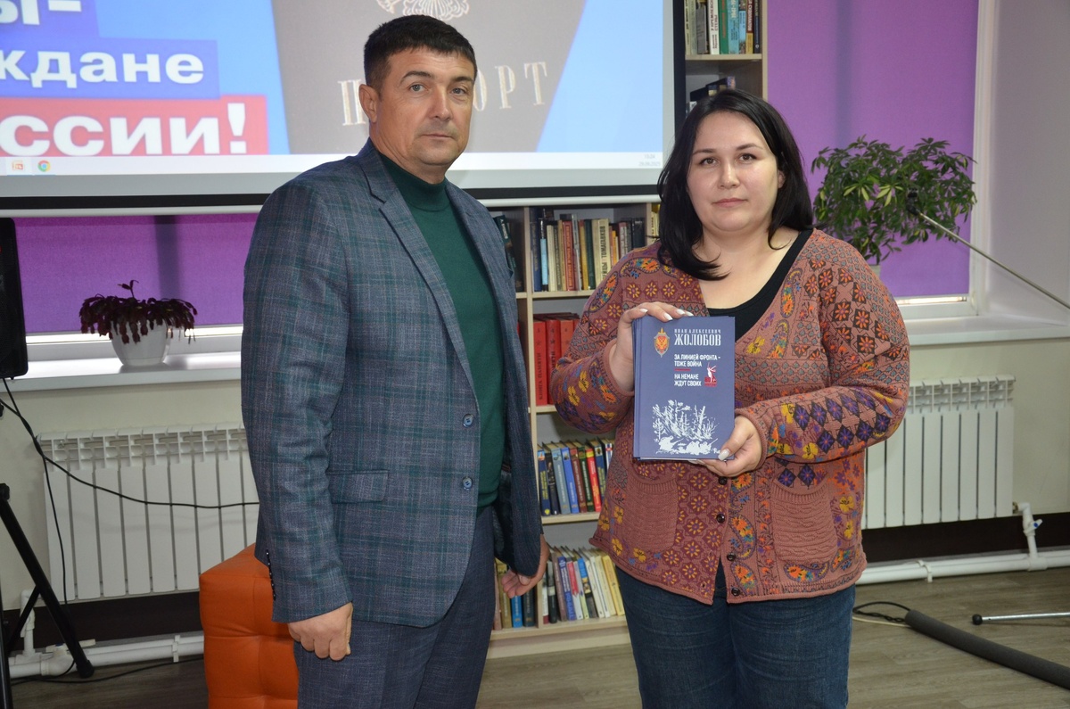 Вручение двухтомника "За линией фронта- тоже война. На Немане ждут своих" Ивана Жолобова 29 сентября в Завьяловской Центральной библиотеке прошло мероприятие для учащихся восьмых классов Завьяловской средней школы N 1, посвященное дню рождения нашего региона. 28 сентября 1937года Алтайский край образовался как субъект Российской Федерации. В честь очередной годовщины региона восемь школьников, достигших 14-летия, в торжественной обстановке получили паспорт из рук главы района Юрия Ходунова. Подарки от Движения Первых – значки и обложки для паспорта - вручила ребятам специалист по организации работы Движения Первых в районе Яна Ковтуненко.Знаменательным событием стало вручение заведующей отделом Центральная библиотека МБУ МфКЦ Завьяловского района Екатерине Чупиной двухтомника «За линией фронта – тоже война. На Немане ждут своих» Ивана Жолобова. Юрий Ходунов, передавая книги Екатерине... Ссылка на публикацию #Завьялово#Культура