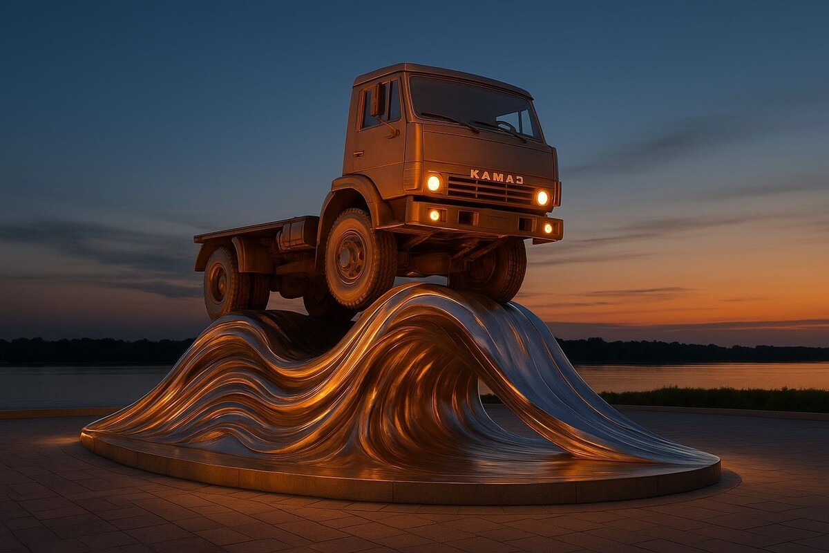 В 2026 году Набережные Челны отметят сразу два юбилея — 400 лет со дня основания города и 50 лет выпуска первого «КАМАЗа». Это уникальная возможность задуматься о том, каким символом можно увековечить историю города и его индустриальное наследие. Нейросеть придумала яркие идеи, которые могут стать настоящей визитной карточкой для туристов и любимым местом для жителей. От грузовика, будто вырастающего из волн Камы, до гигантского металлического сердца — эти концепции создают образ Челнов, который хочется запечатлеть на фото. Вдохновляйтесь и представляйте вместе с искусственным интеллектом, каким может стать городская достопримечательность, отражающая прошлое, настоящее и будущее Набережных Челнов. КАМАЗ на волне Камы Представьте монумент, где первый КАМАЗ будто выезжает прямо из сверкающих металлических волн реки. Солнце играет на поверхности, отражаясь в каждом изгибе, а вечером мягкая подсветка превращает грузовик в сияющий маяк города. Фотография рядом с таким памятником будет словн