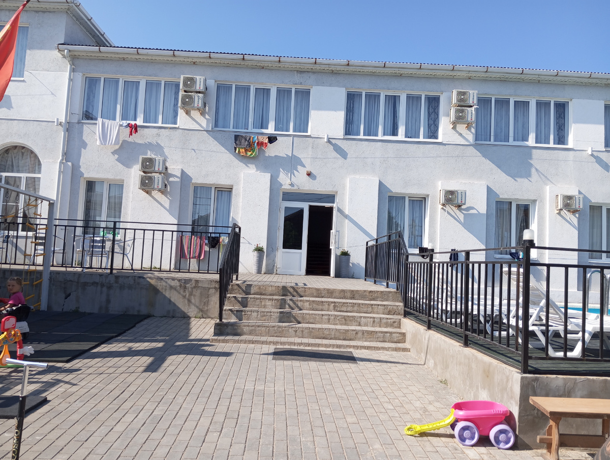 Как я уже упомянула в своей предыдущей статье, на этот раз мы останавливались в самой левой части станицы Голубицкой, и нам здесь понравилось намного больше чем в том году, когда мы жили с правой стороны. Спокойно, нет такого количества народу на пляже, но с другой стороны и рукой подать до центрального пляжа, со всеми его увеселениями. В этот раз, несмотря на непродолжительное количество проведенных в Голубицкой дней, мы пожили аж в двух отелях. Почему - читайте в статье. Первым отелем стал много заранее забронированный по отзывам путешественников отель Азов. Одним из критериев выбора был опять же бассейн, правда в нем мы так и не искупались - море было более привлекательным. Но детки других гостей в нем с удовольствием плескались. Во дворике отеля расположены тренажеры и маленькая детская площадка. Огромным плюсом является то, что в Азове есть собственная столовая, обслуживающая только постояльцев отеля. Так как левая часть Голубицкой достаточно уединенная то до общественных столовых