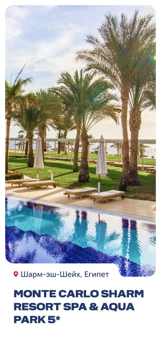 Семейный курорт с живописным рифом и множеством бассейнов Отель, где каждый найдёт своё: дети — весёлые игры и горки, взрослые — релакс в SPA и яркий дайвинг прямо у берега. MONTE CARLO SHARM RESORT SPA & AQUA PARK 5* • Частный песчаный пляж с удобным заходом и живым коралловым рифом, где можно часами наблюдать за рыбками. • Большой аквапарк с горками для детей и взрослых, несколько бассейнов (в том числе с подогревом в зимний сезон). • Просторные зеленые аллеи и сады, где приятно гулять даже в жару. • Спа-центр с процедурами талассотерапии, хаммамом и массажами. • Детский клуб с развивающими программами, мини-диско и внимательными аниматорами. • Разнообразное питание: интернациональная кухня, морепродукты и ужины в ресторанах à la carte. 7 ночей с 11.10 | ультра все включено от 234 931 рублей за двоих Подбор тура/задать вопрос/контакты