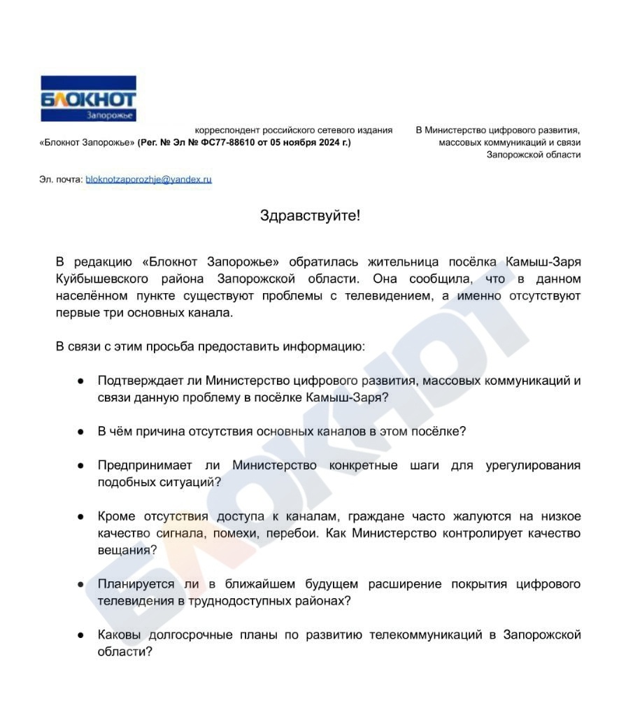 Напомним, в сентябре текущего года в редакцию «Блокнот Запорожье» написала жительница посёлка Камыш-Заря Запорожской области. Она пожаловалась на отсутствие на её телевизоре трёх основных каналов (ЦЭНТВ).