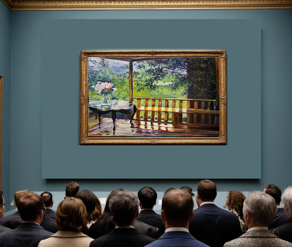 На переднем плане я вижу большую террасу, вся она покрыта лужицами летнего дождя. Особенно мне нравится стол с резными ножками, на котором стоит пышный букет цветов — белые, красные, розовые лепестки, некоторые из них осыпались и лежат на столе, мокрые и красивые, как будто только что попали под порыв ветра. Сам столик выглядит по-особенному, на его поверхности в воде отражаются и сами цветы, и резные детали мебели.
