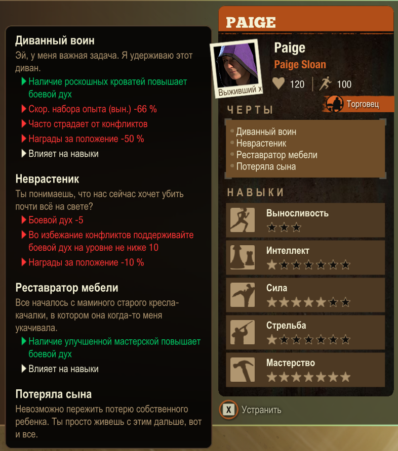 У моей первой коммуны дела шли сравнительно неплохо: огород давал хороший урожай, в мастерской хватало ресурсов на создание взрывчатки и приманок, а боевой дух держался на высоком уровне. Всё изменилось, когда я решила пригласить к себе в сообщество Пейдж (имя, кстати, произошло от фамилии, означающей слугу или помощника, то есть ничего не предвещало беды). Стоит отметить, что черты характера видны только при самостоятельном создании первых трёх выживших, при принятии новых людей извне они закрыты знаками вопроса.