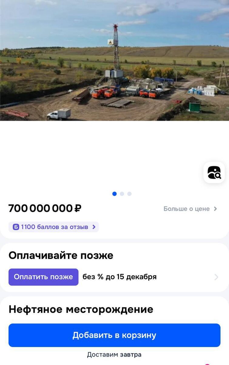 На Ozon теперь можно купить нефтяное месторождение за 700 миллионов рублей. В описании: скважина весом 250 тонн и… доставка курьером на завтра за 700 рублей.