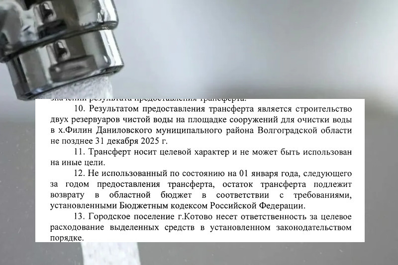Губернатор Волгоградской области Андрей Бочаров подписал постановление о выделении средств из резервного фонда региона городу Котово. Речь идёт о сумме 34,6 млн рублей, которые будут направлены на «мероприятия по выполнению строительно-монтажных работ системы водоснабжения г. Котово».