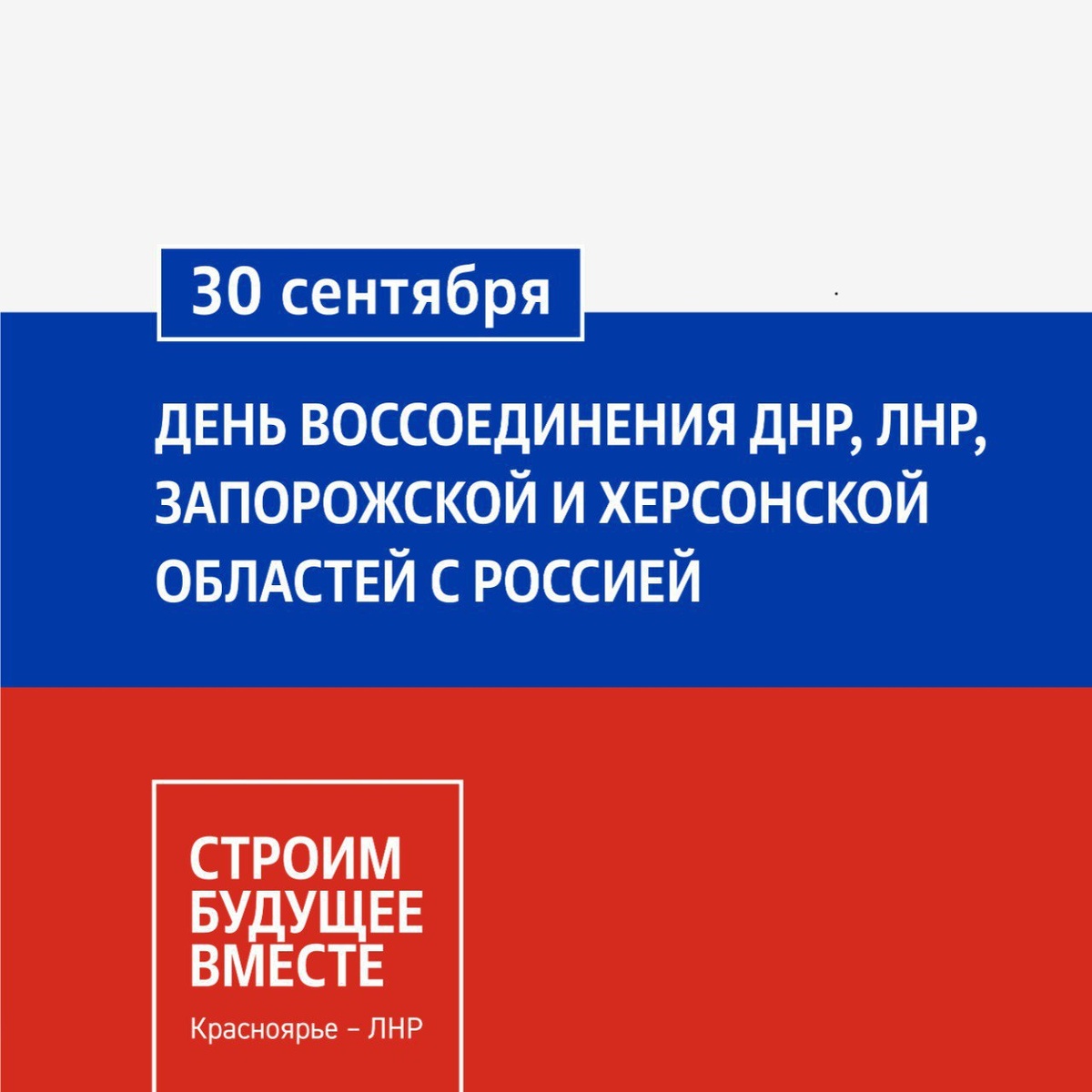 🇷🇺Сегодня, 30 сентября, отмечается День воссоединения ДНР, ЛНР, Запорожской и Херсонской областей с Российской Федерацией 3 года назад региона России взяли шефство надо городами и посёлками воссоединённых территорий. Красноярский край стал куратором Свердловского МО ЛНР. Сегодня, в честь исторического события, в Луганске при участии председателя Законодательного Собрания Алексея Додатко состоится подписание Соглашения о сотрудничестве между Народным Советом ЛНР и краевым парламентом. Этот документ закрепит многолетнюю поддержку и партнерство между нашими территориями. ______ 🔴Оставить обращение ✏️ 🔴Мы в MAX
