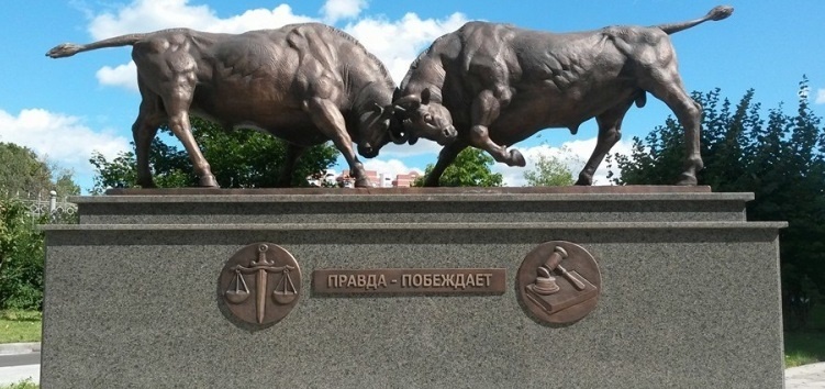 На территории Московского городского суда установлена скульптура, это состязание быков. Два крепких быка уперлись друг в друга рогами, и каждый стремится превзойти другого. На постаменте надпись "ПРАВДА - ПОБЕЖДАЕТ".