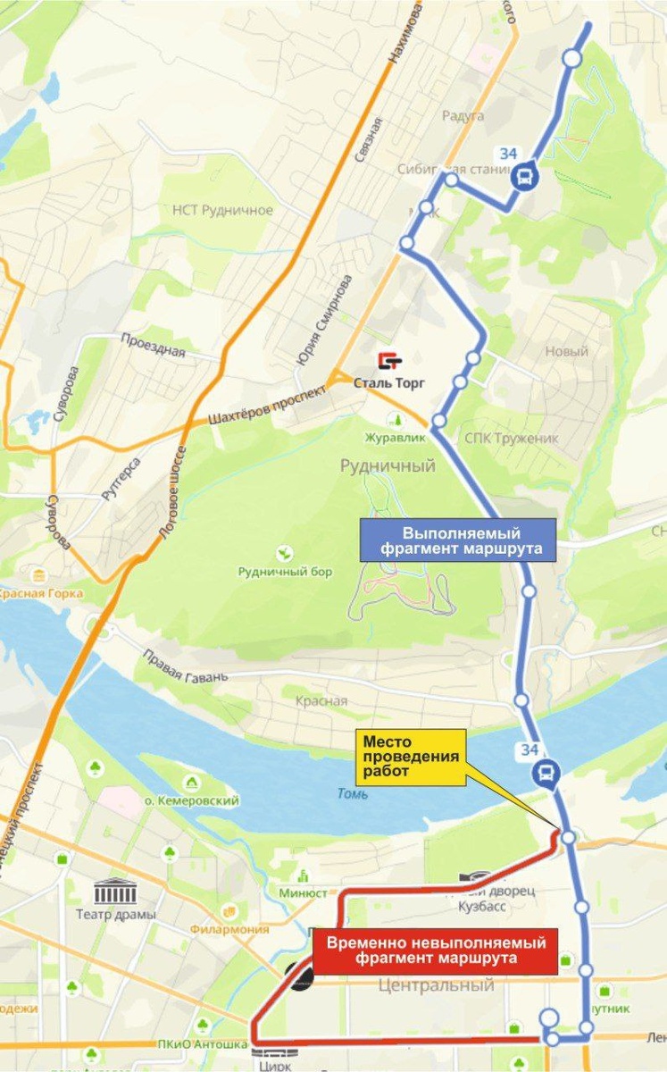 Автобусы № 34 будут курсировать в прямом и обратном направлении: ул. Серебряный бор, просп. Кузбасский, просп. Шахтеров, б-р им. Академика Барбараша, ул. Терешковой, д.п. Центральный.