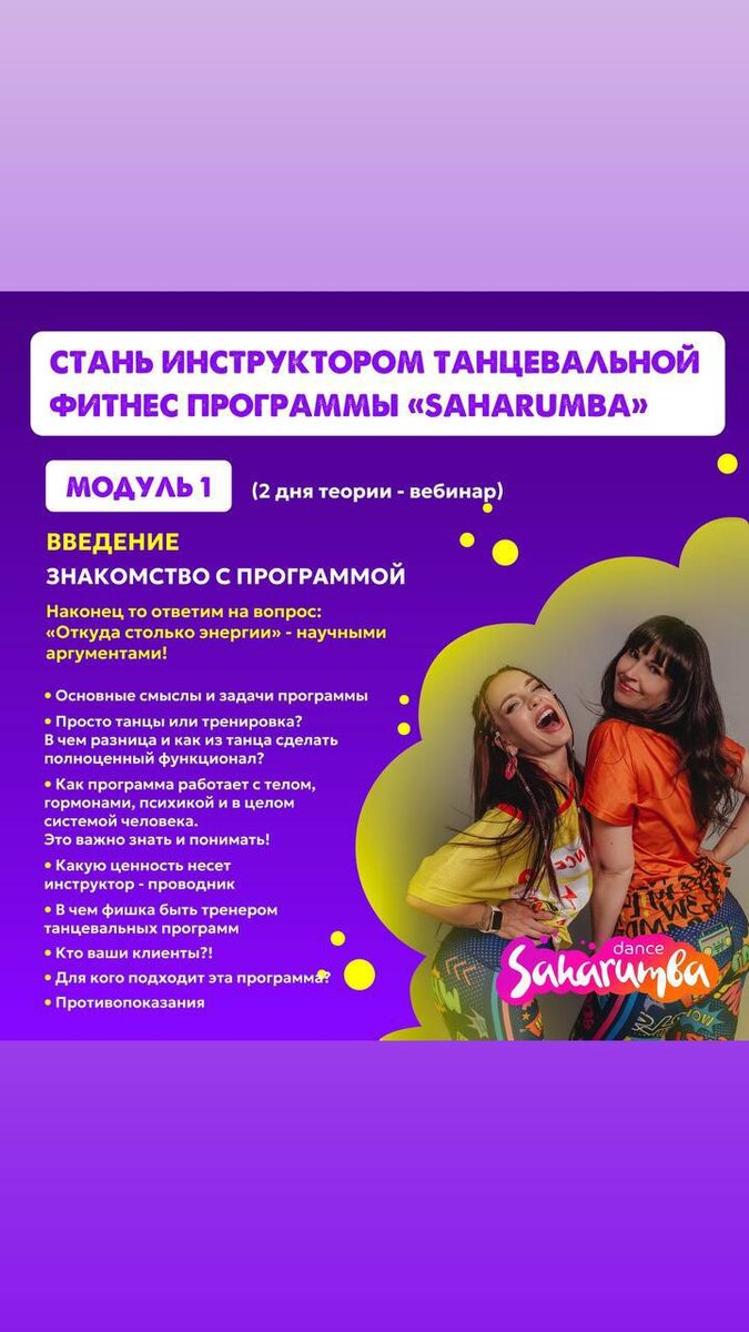 Стань инструктором танцевальных программ “SAHARUMBA” Максимально объемно и продуктивно мы будем с вами проходить курс в течении 30 дней. ✔️КОГДА НАЧНЕТСЯ КУРС? • 1 ноября ✔️СРОКИ ОБУЧЕНИЯ От старта - месяц / доступ к материалам 6 месяцев ✔️КАКАЯ СТОИМОСТЬ И ТАРИФЫ ? Смотрим здесь ✔️ДЛЯ КОГО ? 🔹Для любителей танцев, горячих ритмов/ даже без танцевального опыта (даем все основы) 🔹Для действующих фитнес-инструкторов разных направлений для повышения квалификации 🔹Мини группа. Индивидуальный подход. Раннее бронирование места на курсе = супер условия и бонусы ! Так что если кто-то хотел полноценно пройти курс с усвоением и отработкой техники , новых навыков пишите в комментариях : «+» и я вышлю вам подробную информацию . ❗️Подробнее https://saharokelena.ru/p/e79e30/