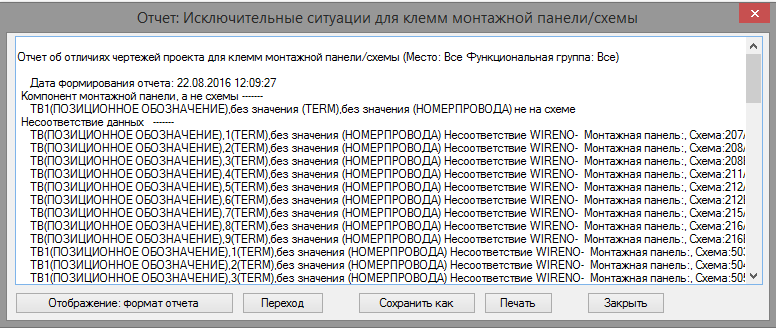 В этот отчет выводятся несоответствия данных клемм на схемах и чертежах компоновок. На панели «Монтажная панель» вкладки «Отчеты» запускаем команду Отчеты. В диалоговом окне «Отчеты по монтажным панелям» выбираем отчет с именем Исключительная ситуация для клемм и настраиваем необходимые параметры. Отчет создается по всему проекту или группе выбранных чертежей, для всех компонентов активного проекта или указанным компонентам на активном чертеже. Нажатием кнопки Повторное отображение последнего выполнения отображается ранее извлеченный отчет. В разделе Условия формирования отчета можно выбрать следующие условия для включения компонентов в отчет: · Элемент монтажной панели не входит в схемы – В отчет включаются клеммы монтажных панелей, не имеющие связанных клемм на схеме, в том числе клеммы, имеющие свободные уровни. · Элемент схемы не входит в монтажные панели – В отчет включаются клеммы схем, не имеющие связанных клемм на монтажной панели. · Несколько экземпляров - В отчет включаются