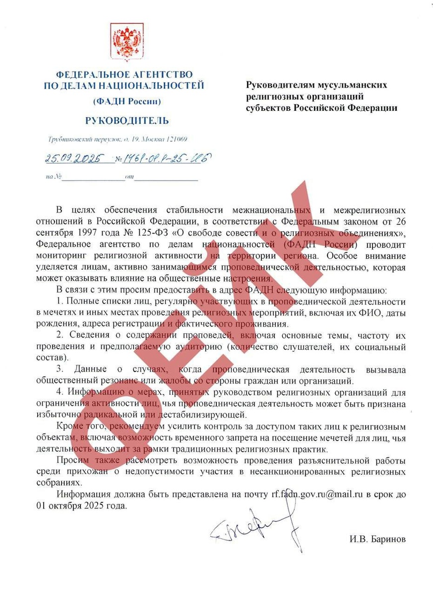🔹 Фейковые запросы о религиозных деятелях и объектах рассылают в Дагестане В Дагестане в адрес муниципальных образований и религиозных организаций поступают фейковые письма о предоставлении информации о религиозных деятелях, проповедниках и религиозных объектах. Об этом сообщает пресс-служба главы региона. Подобные запросы поступают якобы от имени различных федеральных и республиканских министерств и ведомств. «Так, в сети распространяется информация о запросе Федерального агентства по делам национальностей (ФАДН) России от 25.09.2025 г. Данный запрос - фейк, направленный на дестабилизацию внутриконфессиональной ситуации в СКФО и России в целом», - подчеркнули в пресс-службе. 🌐Южная служба новостей