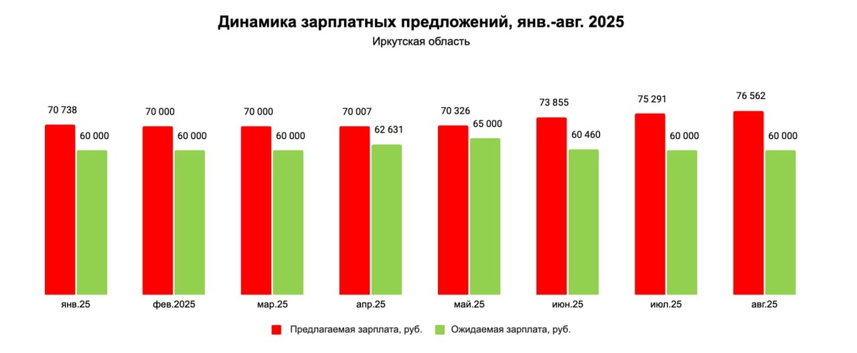 Аналитики российской рекрутинговой платформы hh.ru зафиксировали рост зарплатных предложений работодателей в Иркутской области за первые восемь месяцев 2025 года. С января текущего года медиана предлагаемой заработной платы увеличилась на 8% и составила 76 562 рубля.